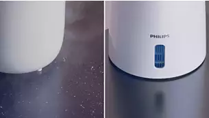Чистите молекули с наноразмер не оставят бели следи или мокри петна Със своя 360° дизайн овлажнителят разпределя овлажнения въздух равномерно в стаята, предотвратявайки мокри петна на пода и върху повърхностите. Технологията NanoCloud също така намалява риска от разпространение на минерали във въздуха, като по този начин предотвратява образуването на бели следи по мебелировката и други повърхности. |