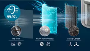 3-layer HEPA filtration traps 99.97% of smallest particles 3-layer filtration made of pre-filter, HEPA NanoProtect and Active Carbon captures 99.97% of particles as small as 0.003 microns (4) – smaller than the smallest known virus! | ![]() |