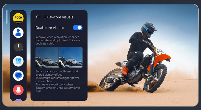 VisionBoost D8 chipset Equipped with a GEX module, POCO F8 Ultra features dedicated graphics boost chipset leverages pre-trained AI models to dramatically enhance image details and deliver high-quality graphics. With advanced motion interpolation technology, dynamic scenes appear smoother and more fluid than ever. | ![]() |