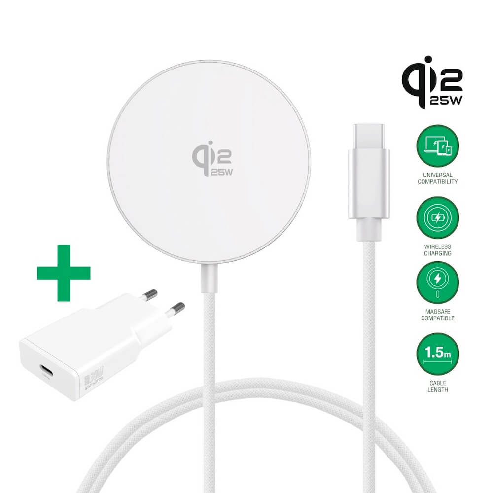 Поставка (пад) за безжично зареждане и захранване за ел. мрежа за iPhone с Magsafe - 4smarts Qi2 USB-C Magnetic Wireless Qi Charger 25W With 30W Wall Charger (бял)