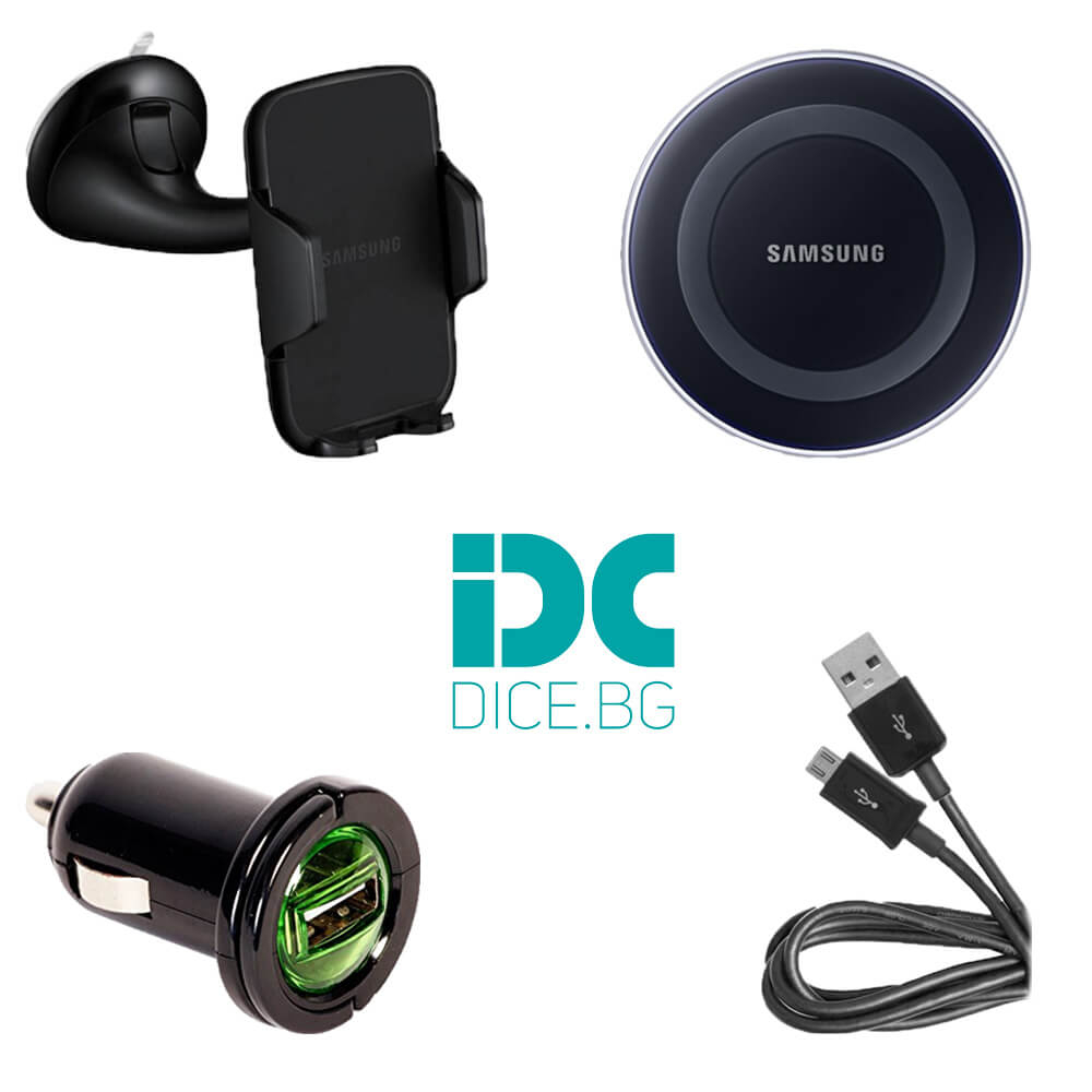 В комплекта: - Samsung универсална поставка за кола - зарядно за кола с USB изход - Samsung безжична индуктивна станция за зареждане - оригинален microUSB кабел