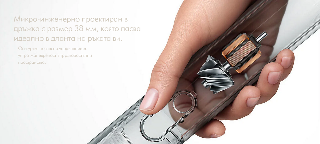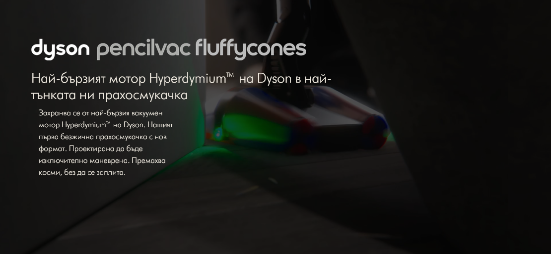 - Най-бързият Hyperdymium вакуумен мотор на Dyson, в най-тънката прахосмукачка в света.