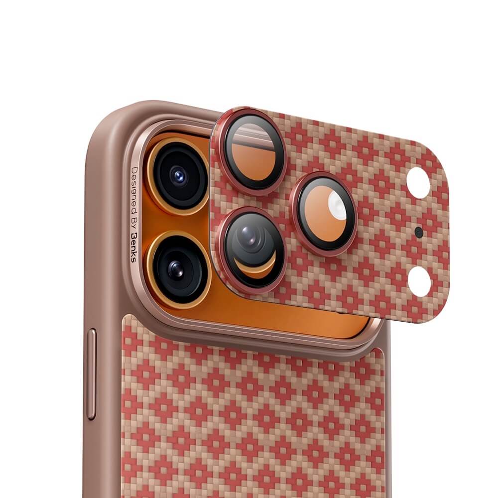 Предпазни стъклени лещи с цяла кевларна плочка за камерата на iPhone 17 Pro - Benks ArmorWarrior Aramid Lens Protector Tempered Glass (оранжев)