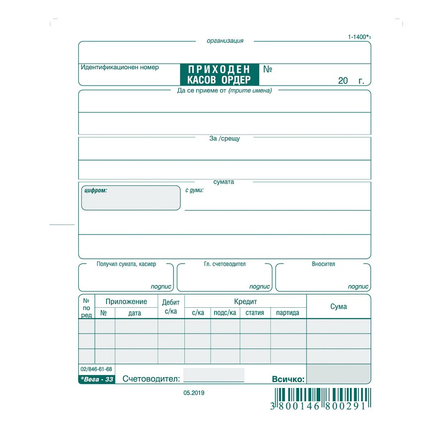 Приходен касов ордер с квитанция блок 1-1400*, химизирана хартия, 100 л.