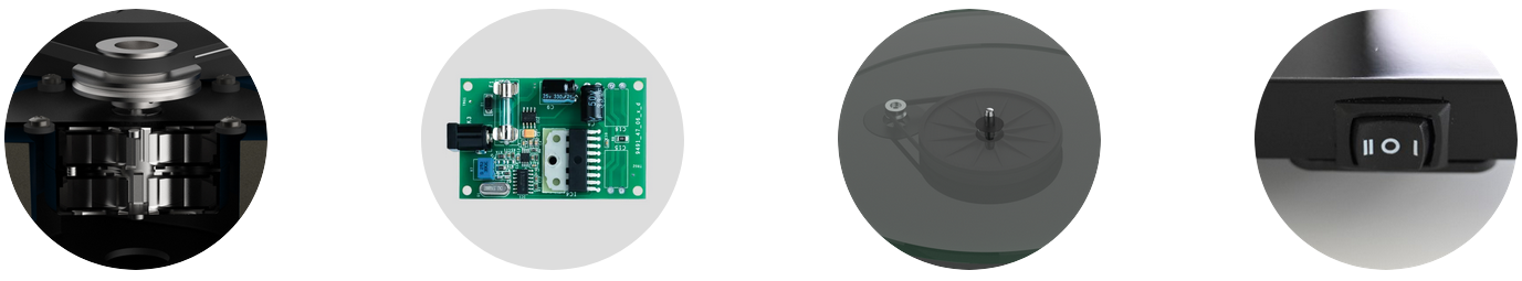 Quality Motor Made in Europe Our precision AC motor ensures flawless vinyl playback with ultra-stable rotation and reduced vibration | Clean Power DC/AC power generator The power generator creates a completely clean new sine wave for the motor. This guarantees very clean power which results in enhanced speed stability. | Belt Drive Precision belt The belt decouples the motor from the big sub platter. This prevents motor vibrations to travel to the needle. | 33 / 45 RPM Electronic speed change The rocker switch allows you to change speeds with the push of only a single button. |