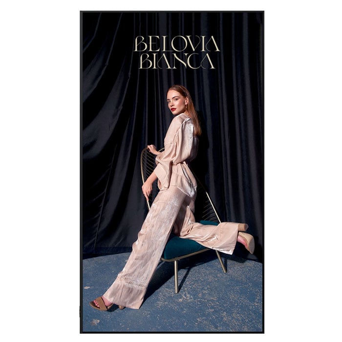 • Дисплеят поддържа както хоризонтален, така и вертикален монтаж, което позволява гъвкаво използване в различни среди. Вертикалната ориентация е особено подходяща за пълноразмерни визии – продуктови изображения, модни кампании и рекламни видеа.