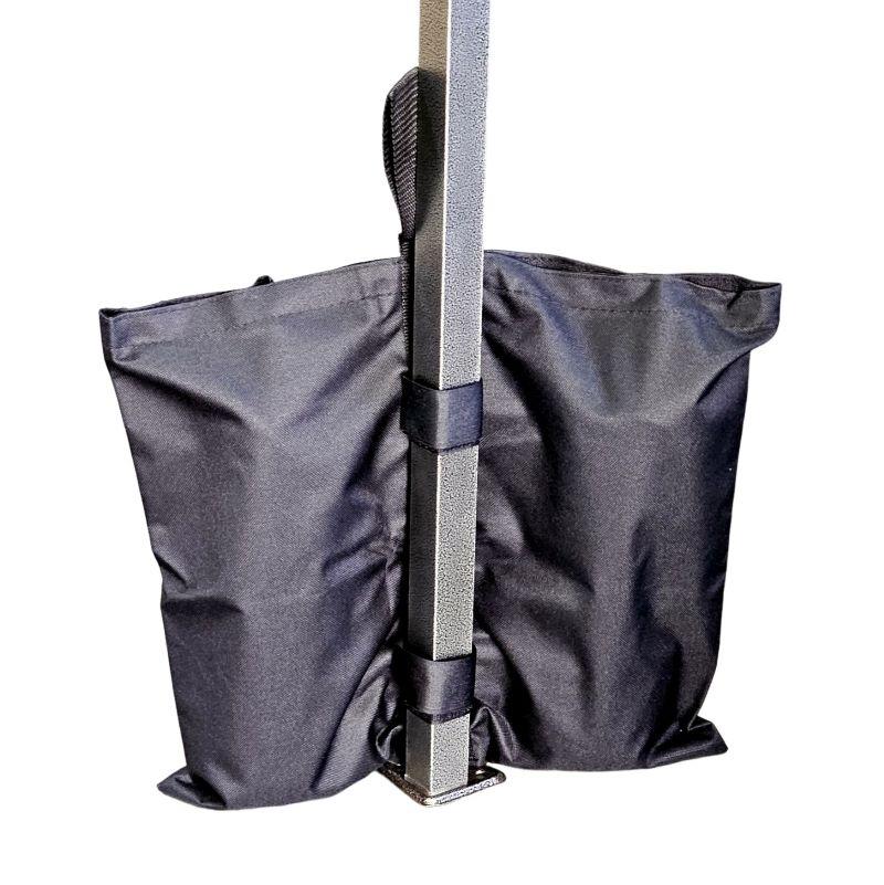 Комплектът тежести на шатра придава оптимална стабилност. Чантите могат лесно да се пълнят с пясък и да се затварят здраво с цип. Тежестите могат да бъдат прикрепени към всички крака с помощта на велкро и допълнителната каишка.
