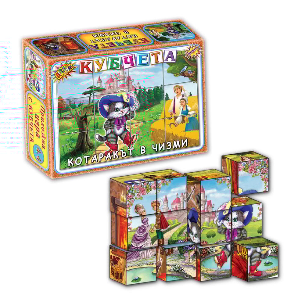 • Комплектът кубчета "Котаракът с чизми" съдържа 12 броя кубчета с размер 4 x 4 cm.