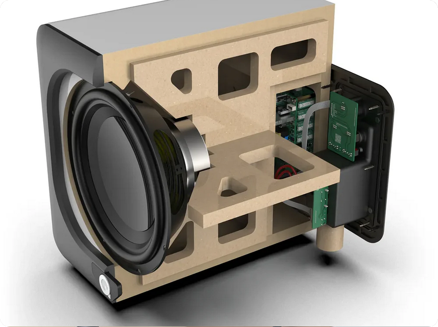 ![]() | The power to perform The custom-designed Q SUB amplifier module includes DSP, power amp and power supply. It has four digital power amp stages in a parallel bridge-tied load arrangement, enhancing efficiency and control by reducing output impedance and heat dissipation. This configuration can deliver up to 200 watts of continuous power and 400 watts peak, with exceptional total harmonic distortion numbers of under 0.1%. |
