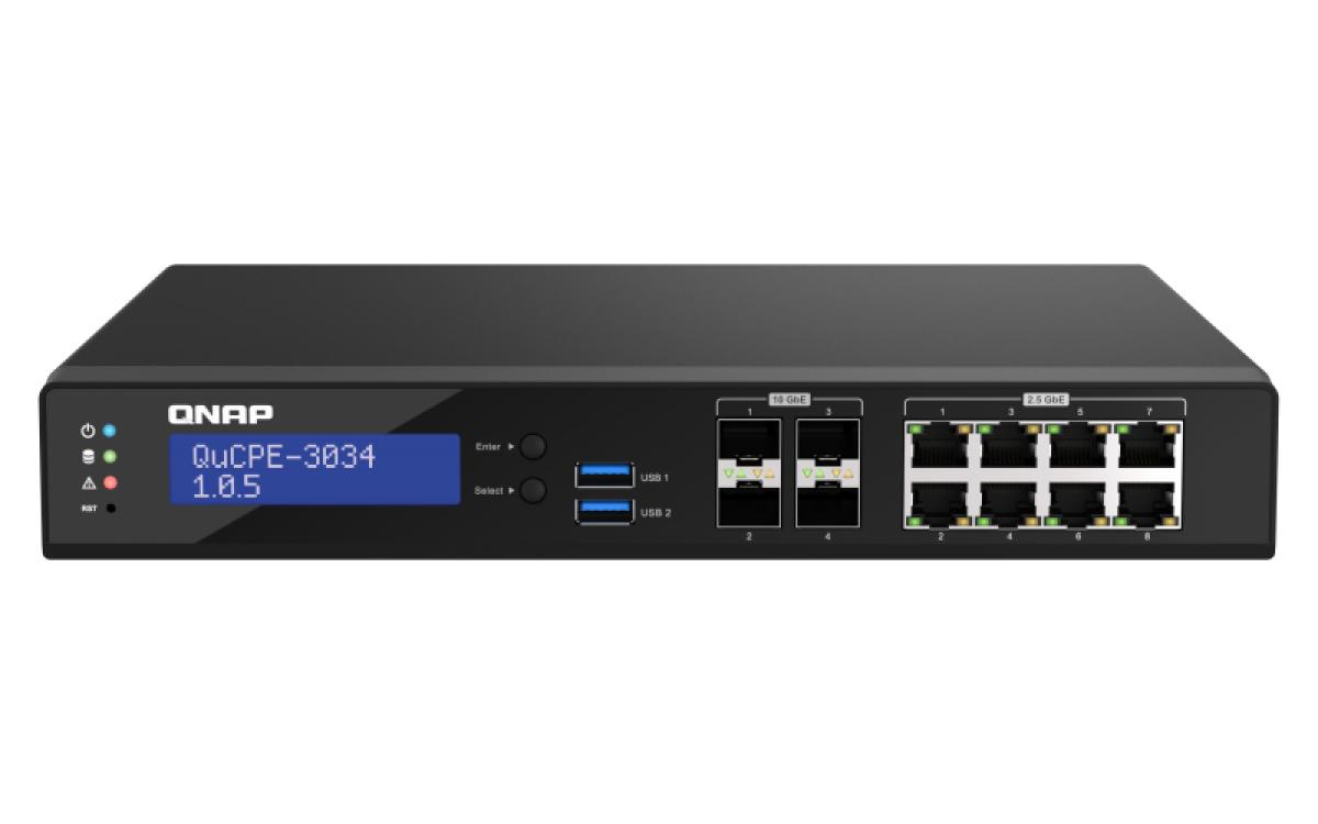 Network Virtualization Premise Equipment with an Intel® Atom Refresh eight-core processor, suitable for deploying virtual networks in multiple edge officesQNAP’s QuCPE-3034 Network Virtualization Premise Equipment is a universal virtualization platform specifically designed for SMBs. The QuCPE-3034 adopts the high-performance Intel® Atom Refresh eight-core processor that supports Intel® QAT, Smart NIC SR-IOV and DPDK hardware acceleration technologies while also providing eight 2.5GbE RJ45 ports and four 10GbE SFP+ ports. With enhanced bandwidth and computing performance for running VNFs and connecting SD-WAN (Supporting VPN/WireGuard), the QuCPE-3034 is suitable for multi-user and multi-tasking business applications. The QuCPE-3034 also features the QNE (QNAP Network Equipment) OS for chaining VNF services and AMIZ Cloud centralized deployment and management platform to realize flexible Zero Touch Provisioning.Build a multi-site network infrastructure for SMBs and Micro-enterprisesQNAP’s high-performance QuCPE integrates the QuWAN SD-WAN solution, AMIZ Cloud platform, and WireGuard VPN. Small businesses and micro-enterprises can flexibly build multi-site network infrastructure by deploying a QuCPE Series 7 in their headquarters, and QuCPE Series 3 in their branches and workplaces.Easily deploy virtual network environments with the 2-in-1 Premise EquipmentWhen deploying virtualized environments, Enterprises often choose to install costly enterprise-grade solutions on edge servers or free solutions with limited technical support – a hard decision for resource-constricted SMBs. In addition, simultaneously running multiple VMs can impact network performance. QNAP’s QuCPE Network Virtualization Premise Equipment combines hardware acceleration technologies, QNAP’s proprietary QNE Network operating system and the AMIZ Cloud centralized management platform to help SMBs build a highly-optimized virtual network infrastructure.The QNE Network Operating System completes your virtual network infrastructureQNAP’s proprietary QNE Network operating system supports the intuitive Network Service Composer and Software-Defined WAN (SD-WAN), allowing for flexible network deployment and multi-site network infrastructure expansion. By supporting Virtual Network Functions (VNF), Virtual Machines and Containers, QNE Network integrates network, computing, and application services to realize network virtualization, application virtualization and efficient management, greatly lowering management and maintenance complexity.AMIZ Cloud - powerful centralized VM management platformThe AMIZ Cloud centralized management platform enables HQ-based IT staff to centrally monitor all edge devices, virtual machines, and containers. Supporting troubleshooting, and remote management via the Account Center, the QuCPE-3034 helps enterprises achieve Zero Touch Provisioning, thus enhancing IT deployment efficiency and reducing maintenance costs.Efficient management via Service Composer with visualized topologyWith the visualized topology of the Network Service Composer, you can easily set up VNFs or VMs, create virtual switches, and allocate physical network resources for chained services by drag and drop. When settings change, you can directly add/remove individual VNFs using the service composer, greatly simplifying operational network combination.SD-WAN enables chaining network servicesQNE incorporates QNAP’s QuWAN SD-WAN solution (subscription-free) to form encrypted VPN tunnels with other QNAP devices based in multiple sites and achieve multi-site network services chaining. For example, you can automatically create a firewall network (using QuWAN and pfSense VNFs) to enhance WAN security in the Service Composer UI using drag-and-drop.Optimize LAN/WAN performanceService Composer also supports SR-IOV and QuWAN SD-WAN, which greatly improves the WAN transmission of the QuCPE-3034 that runs QuWAN, while also helping users to enjoy high-speed and secure LAN and WAN network transmission at the same time.Enhanced securityYou can automatically create a firewall network (using QuWAN and pfSense VNFs) to enhance WAN security in the Service Composer UI using drag-and-drop.Run your VM/VNF Directly on QuCPEQNE Network inherits versatile virtual applications from the QNAP QTS system. QuCPE can simultaneously run multiple virtual machines, software containers, and even bespoke user-made virtual machines in Virtualization Station and Container Station, assisting SMBs in improving deployment and management flexibility while streamlining hardware costs.Intel hardware acceleration technologies boost virtual network performanceSpecifically designed for running virtualization applications, the QuCPE-3034 Network Virtualization Premise Equipment adopts multiple Intel hardware acceleration technologies to allow direct hardware access, thus enhancing VM and virtual network transmission performance.DPDK (Data Plane Development Kit)Allows data to bypass the OS Kernel and directly enter user space to offer a double packet transmission rate (Total T/R x L2) and improve overall virtualization application performance.Smart NIC SR-IOV (Single Root I/O Virtualization)By installing an SR-IOV compatible PCIe SmartNIC, you can allocate bandwidth resources from a physical network card directly to VMs. With traffic bypassing the Hypervisor vSwitch, it helps enhance I/O throughout and network efficiency, ensuring reliable VM applications and reduced CPU overheads.Intel QAT (Intel QuickAssist Technology)Offloads computationally-intensive compression and improves IPsec cryptography VPN performance.Smart IT tools for network management efficiencyQNE Network provides comprehensive management features for Smart IT network management.Notification CenterConsolidates QTS system events and alerts, providing a single-app solution for notifications instead of having to configure individual settings in multiple apps. Notifications can be sent through email, S
