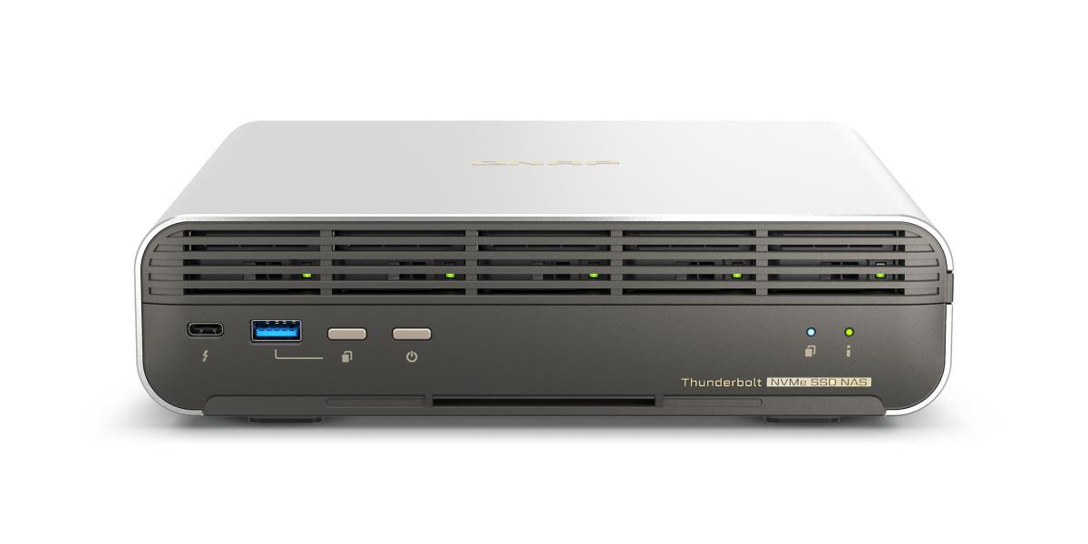 Designed for film sets, small studios, small-scale video production teams and SOHO users, the compact TBS-h574TX Thunderbolt™ 4 all-flash NASbook elevates video production for optimum productivity. It packs high-speed I/O and Intel® Core™ performance required by video production, allowing creators using Mac® or Windows® to enjoy the smoothest experience ever in real-time video editing, large file transfer, video transcoding, and backup. The TBS-h574TX, as the bridge between pre-production and post-production, takes video projects and team collaboration to the next level. The TBS-h574TX runs the ZFS-based QuTS hero operating system that ensures data integrity. You can also switch to QTS operating system based on your needs.Ultra-fast RAW file editingWith an E1.S to M.2 SSD adapter attached in each slot, you can flexibly install five E1.S or M.2 PCIe NVMe SSDs for lightning-fast multimedia file editing.Stay agile for ongoing projectsHot-swappable M.2 SSD and automatic RAID disk replacement enhance system reliability, reduce the risk of data loss, and smoothen ongoing projects.Thunderbolt™ 4 for faster direct connectionsTwo Thunderbolt™ 4 ports allow directly connecting Mac®/PC workstations to the TBS-h574TX, delivering up to 20Gbps for 4K video editing.Hybrid-architecture CPU for multitaskingThe 13th Gen Intel® Core™ processors with hybrid-architecture (P-core and E-core) delivers high performance and efficiency.2.5GbE and 10GbE as standard2.5GbE and 10GbE networks accelerate large file transfer and allow for more connected devices/workstations by attaching a network switch.Faster USB transferTwo USB 3.2 Gen 2 (10Gbps) ports enable fast file import/export from/to external storage devices.All-flash NASbook supporting E1.S/M.2 NVMe SSDs – a perfect companion for video productionCompared to large rackmount all-flash array storage, the TBS-h574TX all-flash NASbook features a compact, portable design with five SSD slots yet delivers extreme performance. It is the ideal choice to accelerate ongoing creative video projects from pre-production to post-production, and seamlessly works with USB DAS (TR-004) for file backup/archiving. The TBS-h574TX is always ready for your next project! An E1.S to M.2 SSD adapter is attached to each drive bay of the TBS-h574TX, providing great flexibility to choose between M.2 SSDs and E1.S SSDs on demand.Enabling hot-swappable M.2 SSDs!As a frontline video production team, there is the risk of project interruptions due to unexpected SSD failures in storage devices. The innovative TBS-h574TX makes M.2 SSDs become hot-swappable for easier drive replacement. Along with supporting automatic RAID replacement with spares (supported from QTS 5.1 / QuTS hero h5.1), if potential drive errors are detected, the system automatically moves data from the affected drive in a RAID group to a spare, before the data on the affected drive is completely corrupted. This reduces system downtime and data loss risks as it avoids RAID rebuilding.High-performance SSDs. Effective heat dissipation.Designed with an excellent cooling system, the TBS-h574TX is equipped with dual fans and supports SSD heatsinks (heatsinks sold separately) to effectively enhance heat dissipation during intensive workloads, allowing creators to confidently enjoy the ultimate performance of SSD.Thunderbolt™ 4 direct connection to workstations for higher productivityThe TBS-h574TX has two Thunderbolt™ 4 ports for high-speed data transfer (up to 20Gbps bandwidth). Mac® (including M1 and M2 chip models) or Windows® workstations can directly connect to the TBS-h574TX for fast and smooth real-time video editing, allowing for the transfer of a 1TB 4K video just in 11 minutes.2.5GbE and 10GbE ports | Productive teamworkThe 2.5GbE and 10GbE ports can be used with a network switch to add more connected devices to the TBS-h574TX for collaboration, significantly reducing file transfer times across devices.USB 3.2 Gen 2 ports | Faster file import/exportCreators and editors can easily import materials from external storage devices to the TBS-h574TX via two USB 3.2 Gen 2 (10Gbps) ports and one USB 2.0 port during pre-/post-production.USB ports | Easier storage expansionThe TBS-h574TX capacity is scalable by connecting QNAP USB DAS TR-004 or USB JBOD TL-D800C to archive massive number of video files for ever-growing storage and backup needs.Compact, aesthetic, yet unmatched performanceThe TBS-h574TX provides content creators the perfect combination of stylish design and performance. With its metal-finish case, it delivers optimized cooling performance. The set-top design makes the TBS-h574TX space-saving – smaller than A4 paper and with only 2.54 liters in volume – ideal for small-scale studios or video production teams looking for a portable solution.Ultimate visual experience with real-time video transcoding and 4K HDMI™ outputThe TBS-h574TX features built-in Intel® Graphics that accelerates video transcoding and graphical computing for converting videos to different formats smoothly. You can also display videos from the TBS-h574TX to a large screen using HDMI™ (4K @30Hz) for capturing details and clearer quality.Manage your video projects flexibly with myQNAPcloud StorageElevate your video production with the compact and powerful TBS-h574TX. During pre-production, you can save large RAW files (hot data) and handle video transcoding on the TBS-h574TX. In post-production you can store small files (cold data) to myQNAPcloud Storage for file archiving and backup, making it easier to remotely access, synchronize, and share files with cross-site team members.Build the best music server with RoonDesigned for music lovers, Roon Server identifies your entire music library stored on the TBS-h574TX, and consolidates it into Roon’s interconnected digital library. Experiencing smooth music streaming service, you just need to download Roon Server app from QNAP App Center and enable Roon music library on SSD 