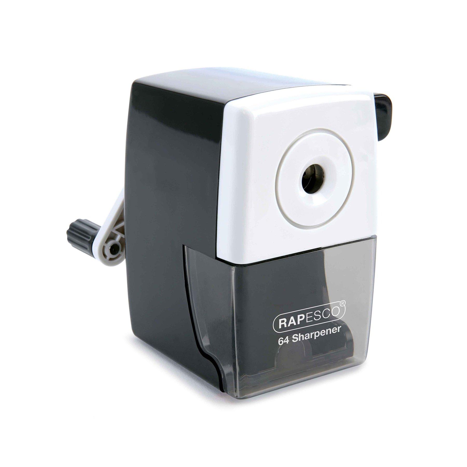 • Rapesco 64 e настолна механична острилка за моливи с прозрачен контейнер за отпадъци. Подострянето става много прецизно, бързо и лесно.