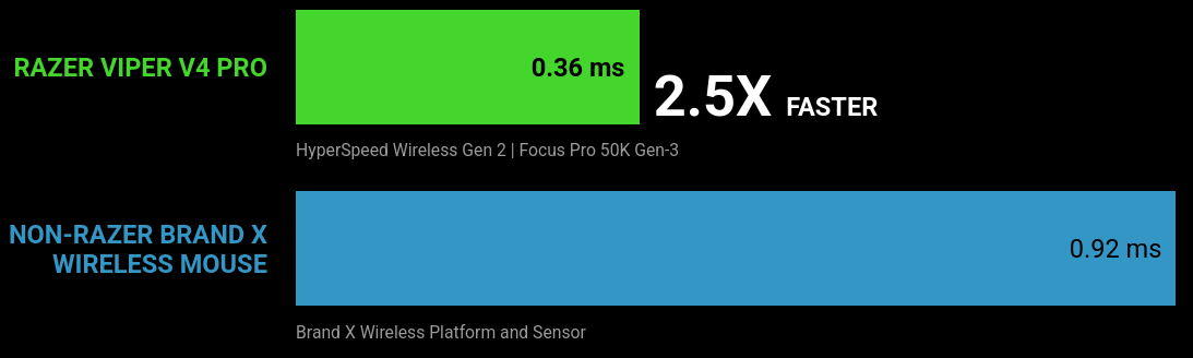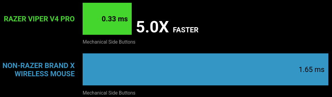 Engineered for peak competitive performance, the Viper V4 Pro holds a decisive lead in click responsiveness. Its mechanical side buttons boast 5.0× lower latency, ensuring faster reactions across every crucial inputs.