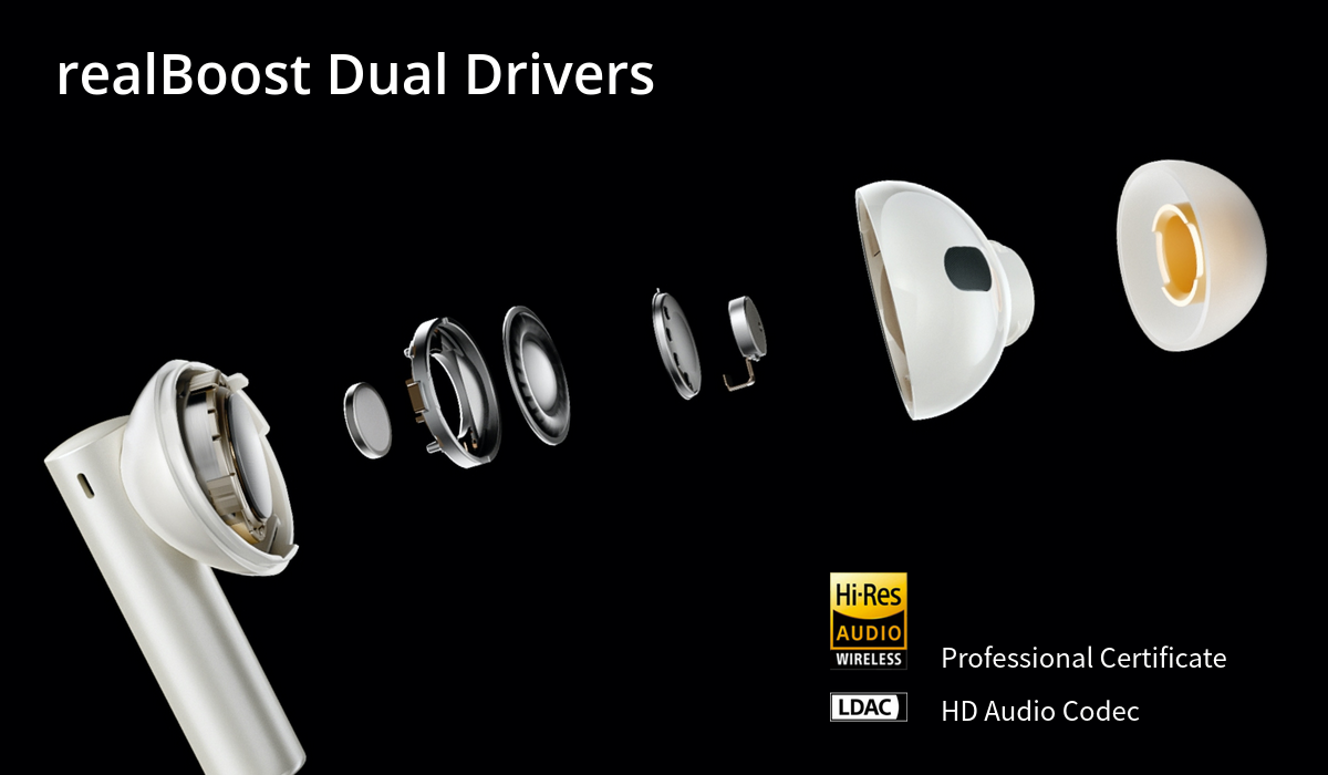 The realme Buds Air 5 Pro support LDAC HD transmission protocol with Hi-Res authority certification, offering an up to 96kHz sampling rate and 990kbps transmission code rate, for true studio-quality acoustic listening sessions.