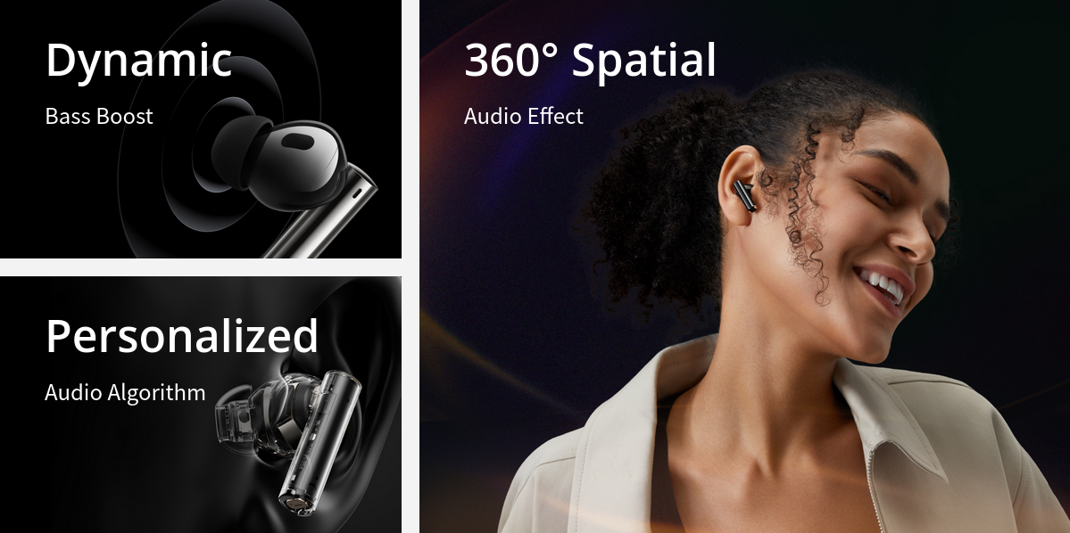 360° Spatial Audio Effect Let the Music Surround You Made in accordance with the HRTF head function model, our self-researched algorithm creates cinema-grade 3D spatial sound, so that the ear canal can feel the full range of immersive listening, with unlimited Bluetooth devices and unlimited audio sources, for a cinema-grade experience at any time. |