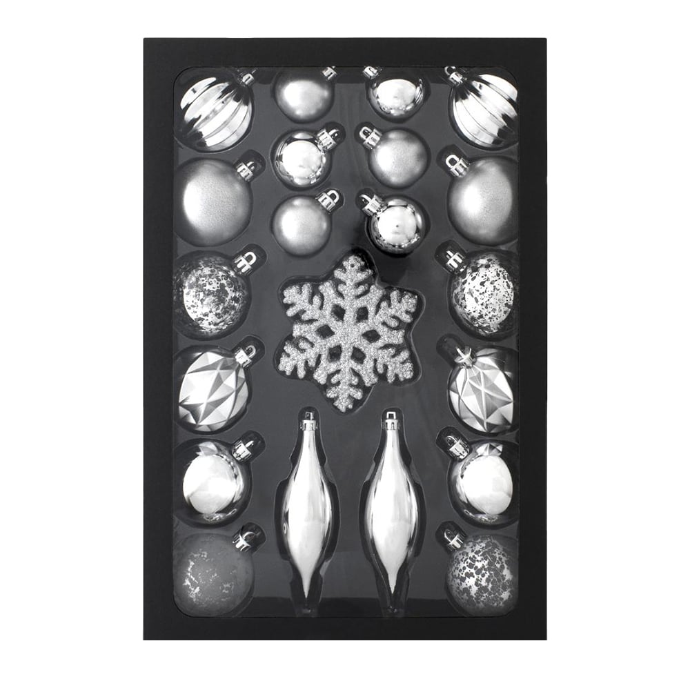 • Комплект от 25 сребристи коледни играчки, подходящи за украса на коледната елха или празничния декор.