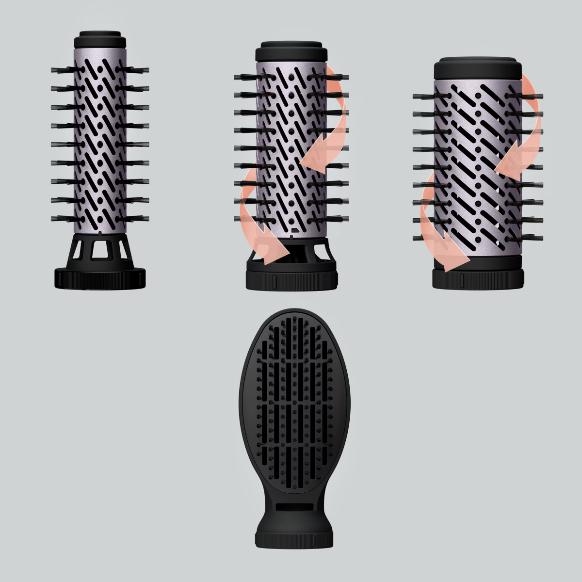 Универсално оформяне 2 въртящи се четки (40/50 мм) и една 30 мм четка за всички типове коса, за невероятен външен вид и отлична универсалност — с плоска четка за по-гладки резултати. | ![]() |