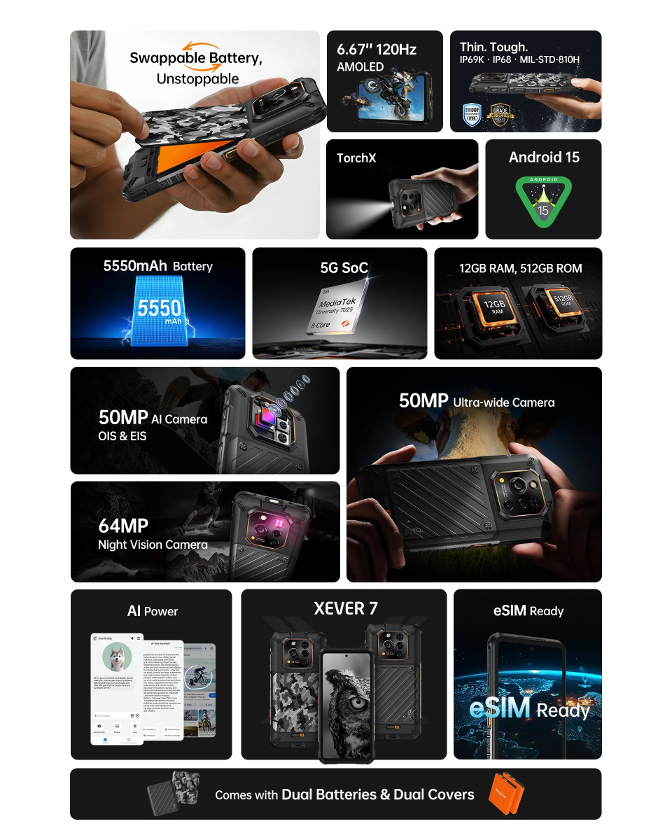 Rugged, but never bulky. Weighing just 325g and pure comfort in your palm, Xever 7 is built for your adventure. Power on endlessly with a swappable battery for easy access, and switch up your style with customized vibrant covers, especially the exclusive Camo Edition.