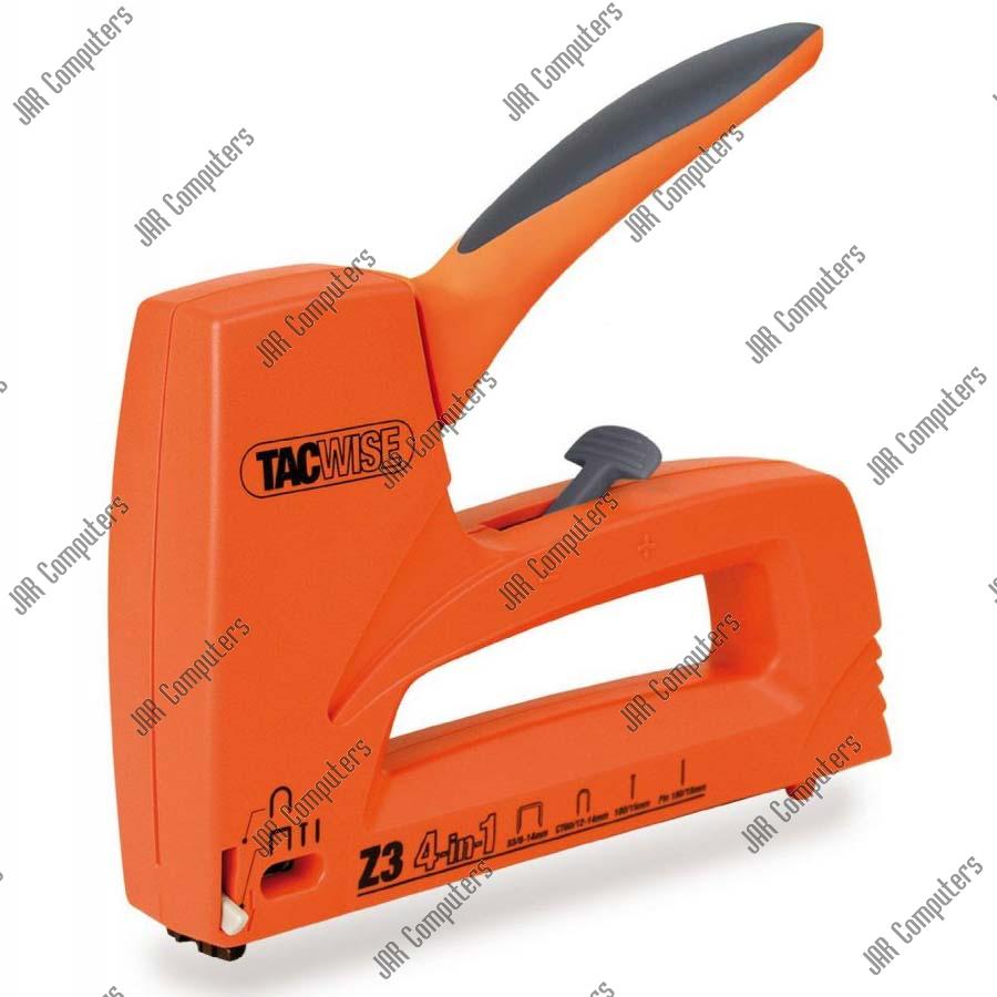 Професионален ръчен такер 4 в 1 TACWISE работи с телчета J 140, изработен от пластмаса. Такерът работи с телчета с размер 6-14мм, капацитетът на пълнителя е 150 телчета. Зареждането на всеки от консумативите става бързо и лесно, чрез бутане на малкото лостче. Работи със скоби СТ-60 с размер 12-14 мм и капацитет на пълнителя 85 скоби. Може да работи и с пирони 180 / 15 мм и пирони без глава 180 / 15 мм, капацитет на пълнителя 85 пирона. Предлага се с 1 година гаранция. Такерът е незаменим, широко разпространен инструмент с приложение било в бита, било в редица професионални дейности. Такерите основно работят със специални скоби, поради което са идеалният инструмент за приковаване към основа от дърво на различни материали, които лесно се прокъсват или не могат да бъдат захванати с гвоздеи. Това ги прави задължителен инструмент в тапицерството, при закрепване на противокомарни и други мрежи към дървени рамки, приковаване на гумени уплътнители към врати и прозорци, закрепване на хидроизолиращи и пародифузионни фолия (мембрани) при изпълнение на покривни покрития и т.н.