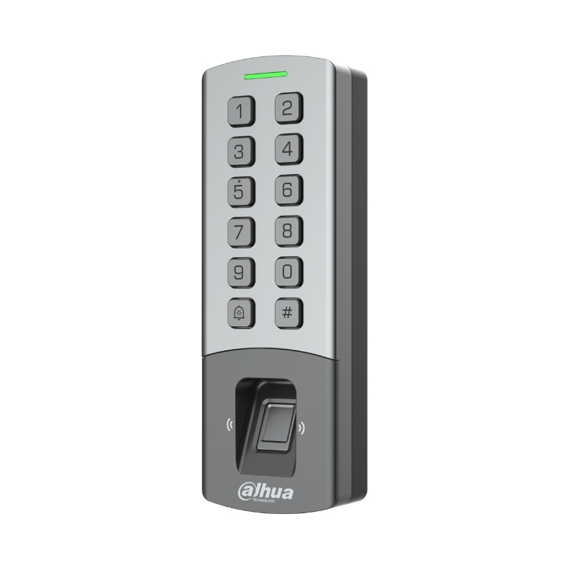 Метален самостоятелен контролер за контрол на достъп с вграден четец за пръстов отпечатък и четец за карти. Карта Desfire (EV3, съвместима с карта Dahua). Памет за 10 000 потребителя/карти/пароли, 3000 пръстови отпечатъка, 100 000 събития. Механична клавиатура с подсветка. RS-485, Wiegand, RJ45 10/100, 2x Алармен вход, 1x Алармен изход, 1x вход за exit бутон, статус на врата. Захранване: 12 VDC, 1.5 A/PoE. IP65;IK08, –30 °C to +60 °C . SmartPSS lite, DSS PRO and DMSS