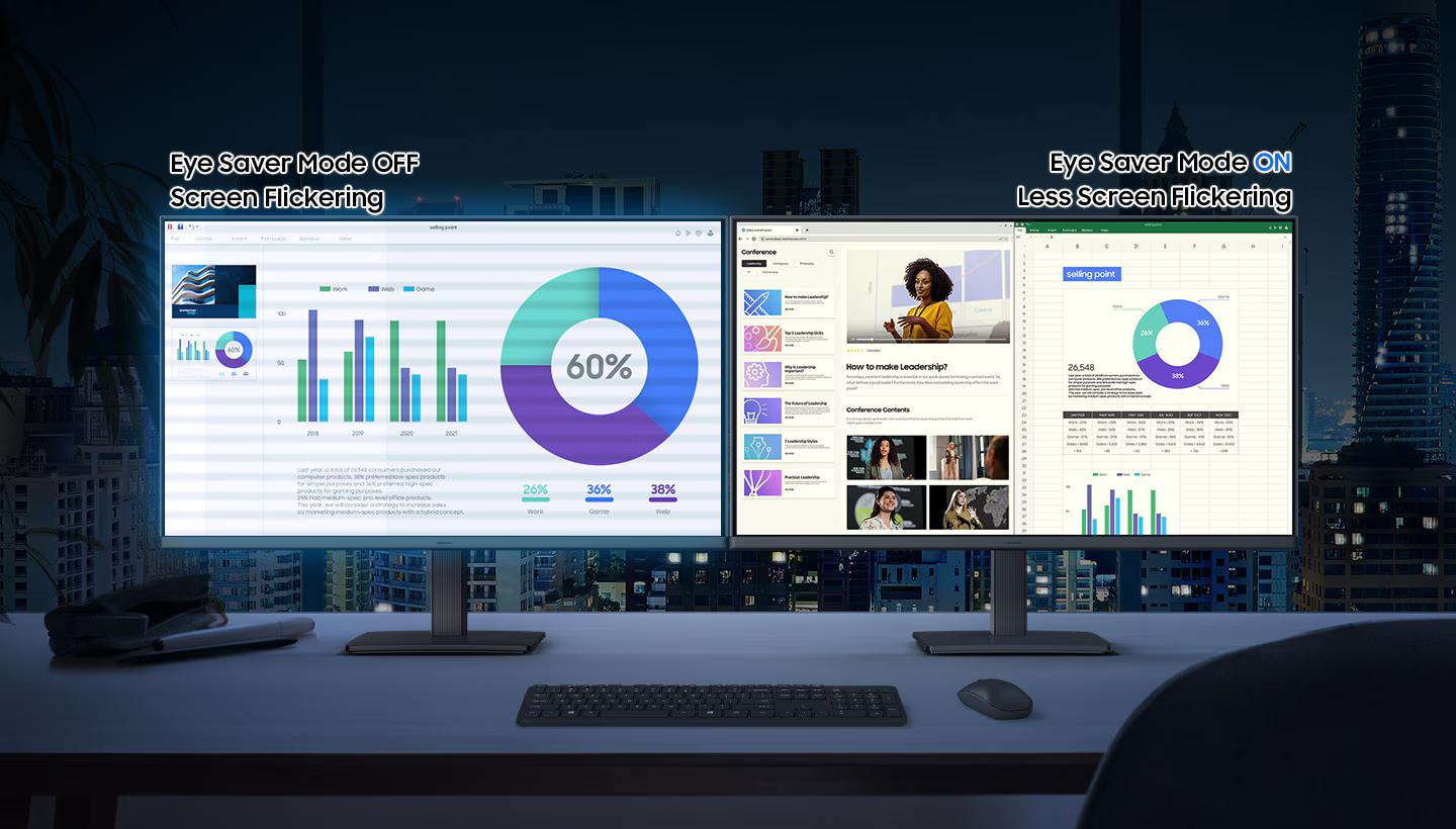 Грижете се за очите си и се чувствайте комфортно, дори по време на по-дълги сесии. Останете фокусирани върху работата си с намалена синя светлина и по-малко трептене на екрана.