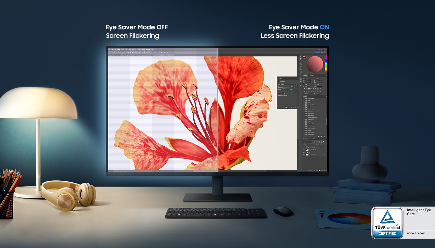 Дайте почивка на очите си – дори по време на дълги сесии. Яркостта и цветната температура се настройват автоматично към обкръжаващата ви среда, идеални за проекти късно през нощта. Благодарение на сертифицираната от TÜV технология, Samsung намалява трептенето на екрана и предпазва очите ви от прекомерна синя светлина с режим Eye Saver.