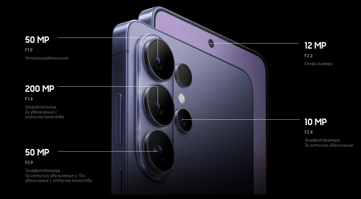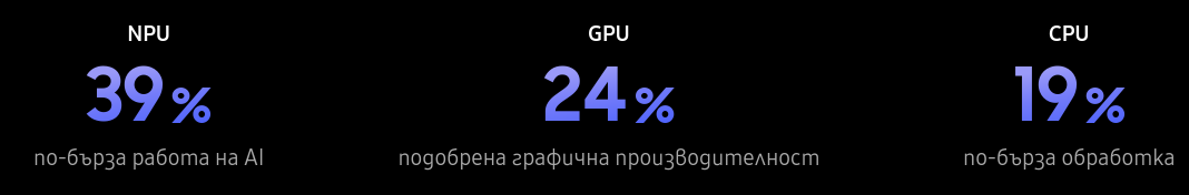 Запознай се с най-новия и най-мощен процесор, предлаган досега в Galaxy. Проектиран е да отключи пълния потенциал на Galaxy AI за хора, които изпълняват много задачи едновременно, захранвайки персонализирано подобрение на изображенията, което изостря и изглажда визуалните ефекти в приложенията и съдържанието в реално време. В допълнение на това е с 39% подобрение в работата на усъвършенствани NPU и 24% по-добра графична обработка, която се справя с най-тежките игри за мобилни геймъри.