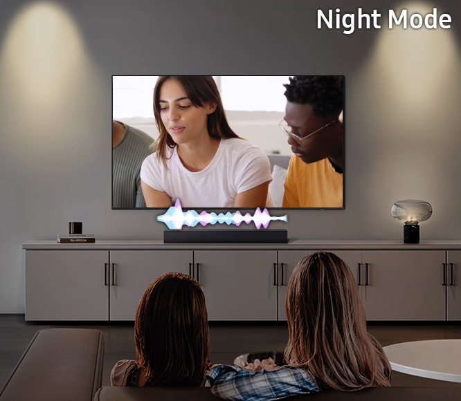 Нощен режим Улови диалога, без да пречиш на другите Гледай телевизия през нощта, без да събуждаш останалите вкъщи. Нощният режим компресира басите, за да намали децибелите, като осигурява по-меко звучене и същевременно поддържа аудиото ясно. | ![]() |
