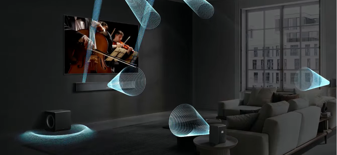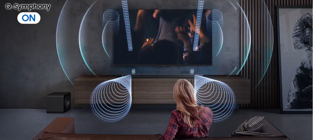 With Q-Symphony, AI separates voice and background sounds for playback through the optimal channel. Now you get crisper dialog and more immersive 3D surround sound, playing through your TV speakers and soundbar in complete synergy.