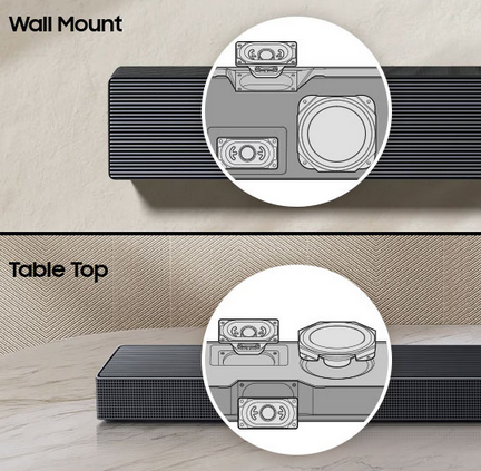 Convertible Fit The speakers are designed to function as both front- and up-firing channels, automatically adjusting their output direction based on the soundbar's placement. | ![]() |