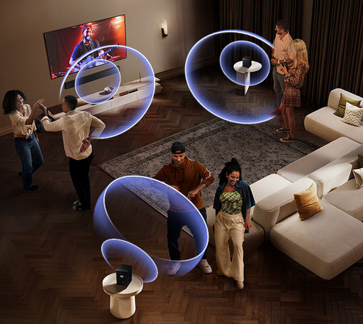 ![]() | Sound Grouping Group play with the rear speakers for room-filling music Sync the rear speakers with the soundbar to play the same sound in harmony. With immersive music that fills the entire room, you can bop and beat to a body-rocking rhythm. |