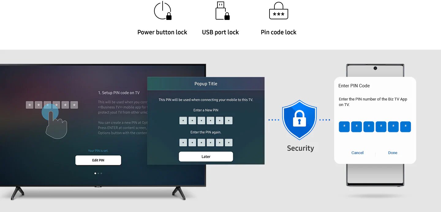 Прекарвай по-малко време за справяне с технически проблеми. Таймерът за включване/изключване позволява на телевизора да работи автоматично през работно време, а пин-кодът защитава настройките на дисплея, като предотвратява евентуални прекъсвания в съдържанието.