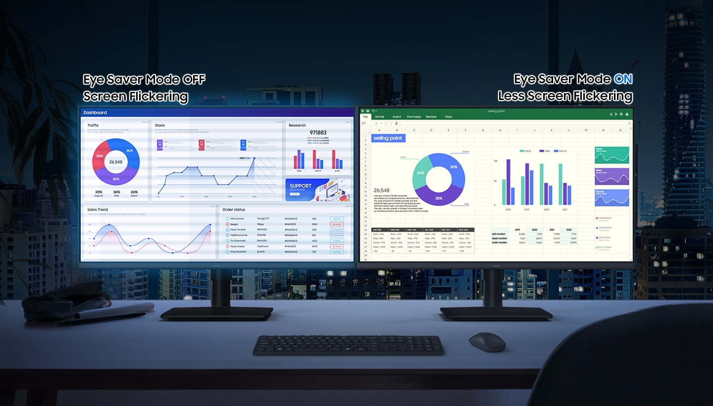 Защитете зрението си и се чувствайте удобно дори по време на дълги сесии. Останете фокусирани върху работата си с намалена синя светлина и трептене на екрана.