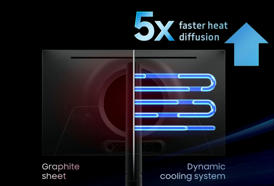 Dynamic Cooling System Вграденa за първи път в монитор, технологията Pulsating Heat Pipe използва охлаждаща течност, която се изпарява и кондензира, за да разсейва топлината пет пъти по-бързо от графитен лист. Това значително понижава вътрешната температура и предотвратява прегряване и остатъчни изображения (burn-in ефект) | ![]() |
