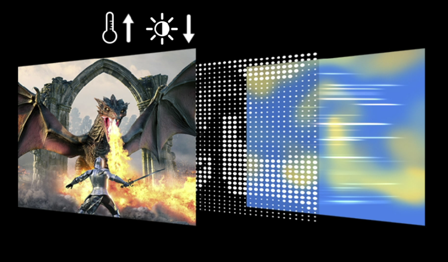 Thermal Modulation System Системата Thermal Modulation използва алгоритми, които автоматично регулират яркостта и предпазват устройството от прегряване. * Когато настройката „Регулиране на яркостта на логото“ е на „Изкл.“ или „Ниска“, термичната модулация е активна само в предварително зададени режими на картината.* Когато настройката „Регулиране на яркостта на логото“ е на „Висока“, термичната модулация е винаги активна. | ![]() |
