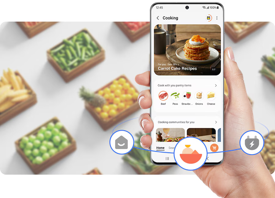 Интелигентен начин да готвиш вкусна храна SmartThings Cooking Управлявай покупките на продукти и приготвяй храна по-ефективно. SmartThings Cooking* ти дава опцията да създадеш списък с продуктите в хладилника, да следиш кога изтича годността им и да си наясно с наличностите по всяко време и навсякъде. * Налично на устройства с Android и iOS. Необходима е Wi-Fi връзка и акаунт на Samsung. | ![]() |