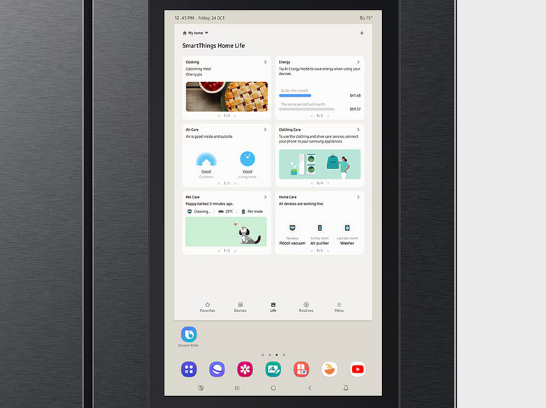 Управлявай лесно своите интелигентни домакински уреди Свързан начин на живот Приложението SmartThings* ти позволява да управляваш смарт устройства с гласови команди или с докосване на бутони. Интегрирането на Google Nest** също ти позволява да управляваш устройства с Nest, а функцията Ring Doorbell*** ти показва кой звъни на вратата. *Налично е на устройства с Android и iOS. Необходима е Wi-Fi връзка и акаунт на Samsung. Наличието на услугата SmartThings Home варира в зависимост от държавата.**Google и Google Nest са търговски марки на Google LLC.***Съвместимо с Ring Video Doorbell Elite / Ring Video Doorbell Pro with Chime Pro / Spotlight Cam Mount / Spotlight Cam Wired / Stick Up Cam Battery / Video Doorbell / Video Doorbell 2 / Video Doorbell 3 / Video Doorbell Pro. Наличието на Ring Doorbell варира в зависимост от държавата.****Услугите за интегриране на Nest и Ring може да не са налични в определени държави и съдържанието на услугата може да се различава в отделните държави. | ![]() |