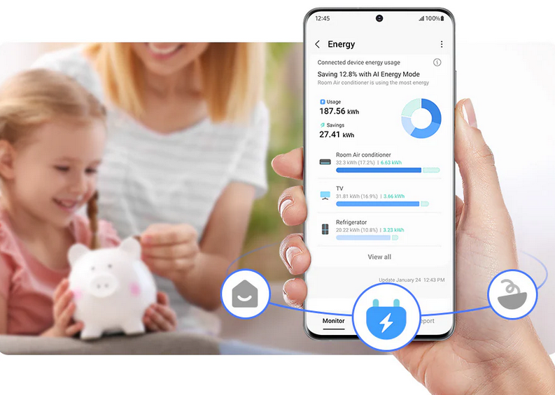SmartThings Energy Ефективно използване и спестяване на енергия Намали въглеродния си отпечатък и спести пари. SmartThings Energy* ти предоставя съвети за енергийна ефективност и следи консумацията на енергия от домакинските уреди** в реално време и я сравнява с предходния месец. Предупреждава, ако планирания от теб разход може да бъде надвишен. *Налично на устройства с Android и iOS. Необходима е Wi-Fi връзка и акаунт на Samsung.**SmartThings Energy в момента работи с около 40 домашни уреда Samsung със SmartThings функционалност. Сред тях са перални, сушилни, съдомиялни, климатици, пречистватели на въздуха, прахосмукачки, фурни, аспиратори, готварски плотове, микровълнови печки, телевизори (от юни 2022 г.) и електромери. | ![]() |