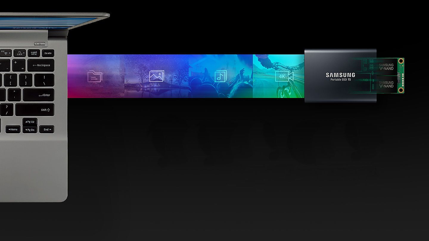 Samsung Portable SSD T5 извежда скоростта на трансфер на данни на следващото ниво и създава една нова практическа работа в областта на външната памет. С компактен и издръжлив дизайн и защита с парола, T5 е наистина лесен за пренасяне и съхранява защитено данните.