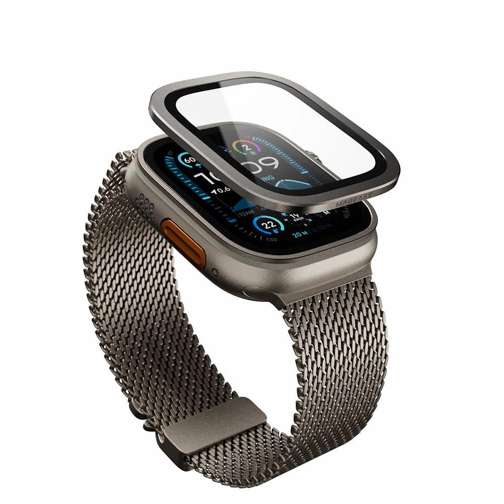 Сапфирено калено стъклено защитно покритие с титаниева рамка за Apple Watch Ultra, Ultra 2, Ultra 3 49мм - MagEasy Fortiz Sapphire Tempered Glass (титан-прозрачен)