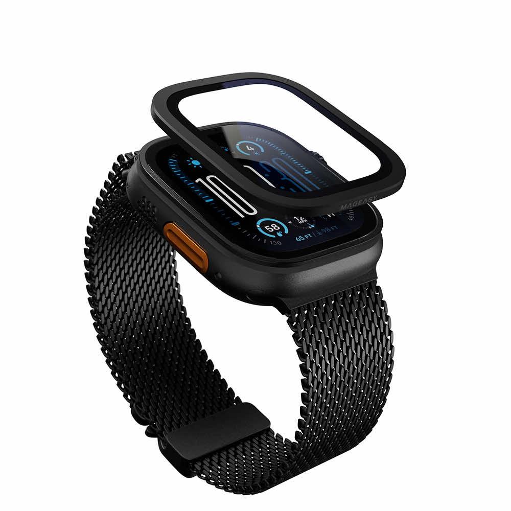 Сапфирено калено стъклено защитно покритие с титаниева рамка за Apple Watch Ultra, Ultra 2, Ultra 3 49мм - MagEasy Fortiz Sapphire Tempered Glass (черен-прозрачен)