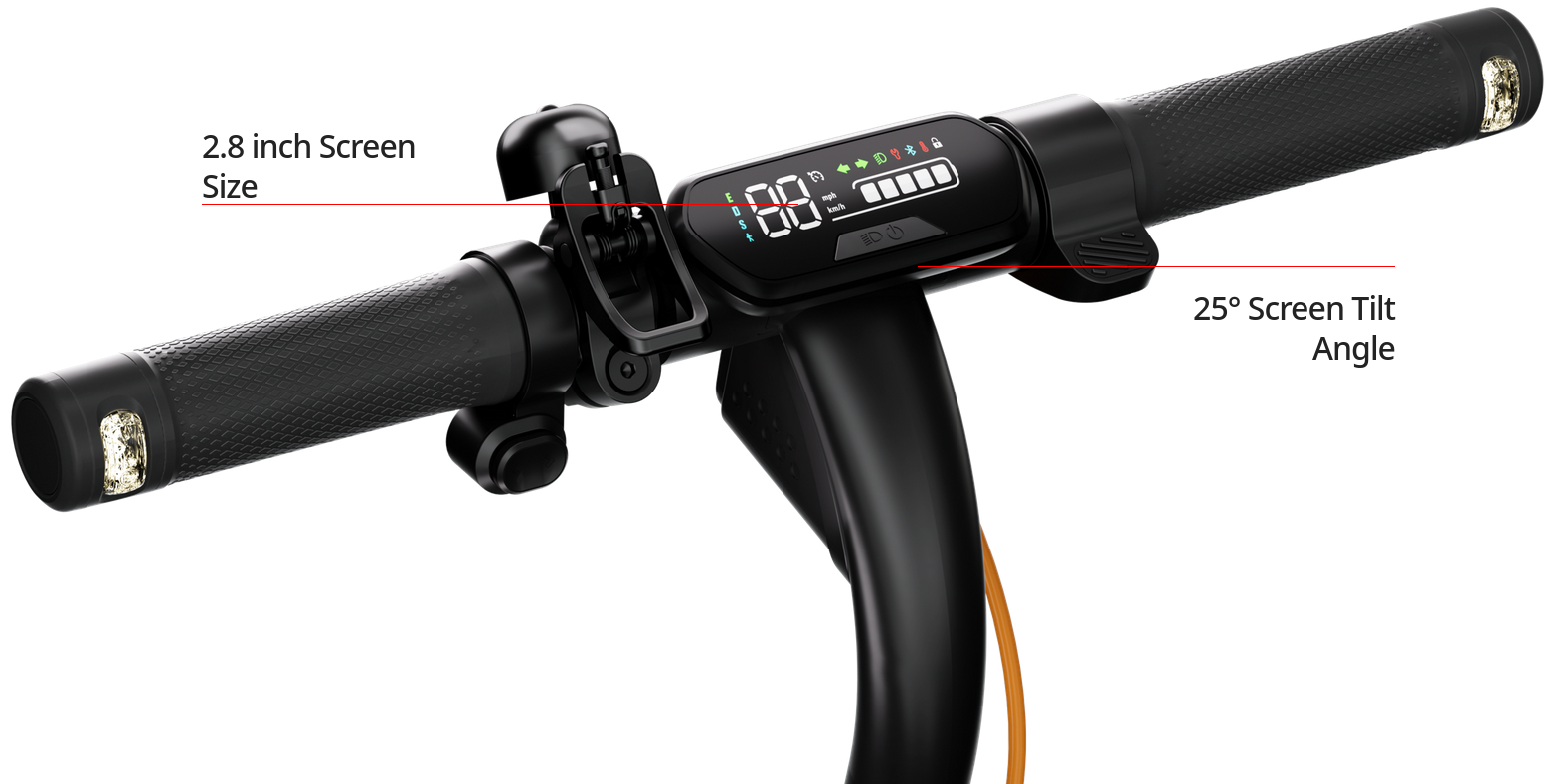The E2 Series features a larger dashboard design of 2.8 inches displaying a clear overview of speed and battery level. The ergonomic 25° screen tilt angle ensures comfort and easy viewing during riding.