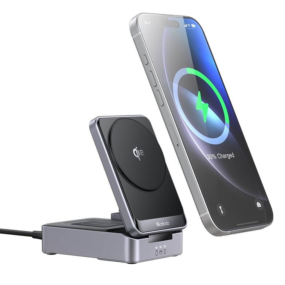 Сгъваема тройна поставка (пад) за безжично зареждане за iPhone с Magsafe, Apple Watch, AirPods, Qi съвместими устройства - Mcdodo Foldable 3-in-1 Magnetic Wireless Charging Station Qi2 22.5W (тъмносив)