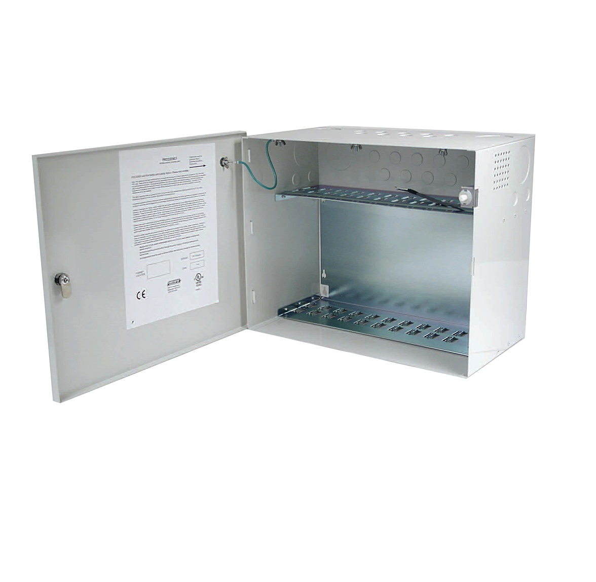 Шкаф за стенен монтаж с 9 слота за Master и Slave контролери. Място за захранване и батерия. Размери: 353x432x229mm.