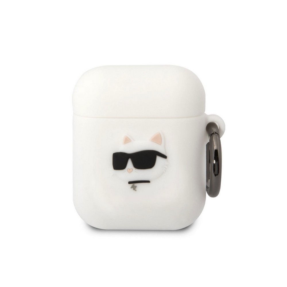Силиконов калъф с карабинер за Apple AirPods и Apple AirPods 2 - Karl Lagerfeld AirPods 3D Logo NFT Choupette Head Silicone Case (бял)