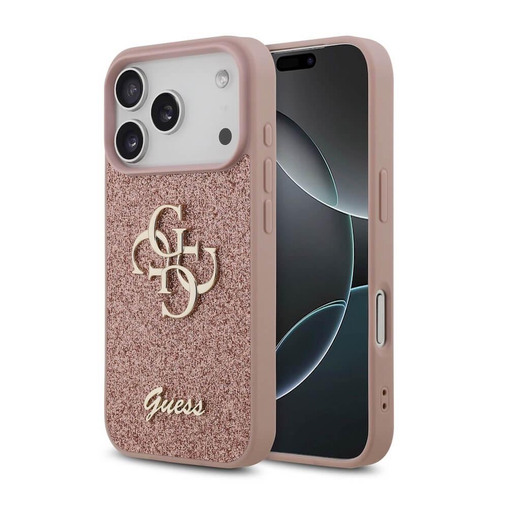 Силиконов (TPU) калъф за iPhone 17 Pro - Guess PU Fixed Glitter 4G Metal Logo Case (розов)
