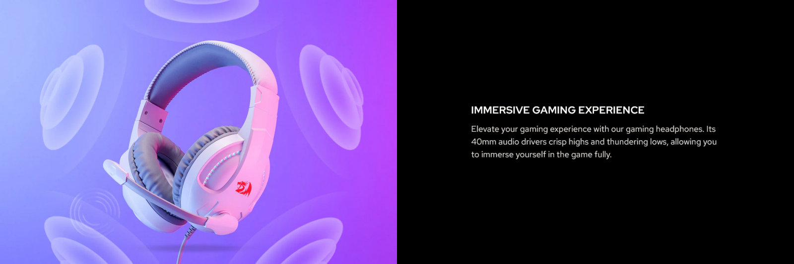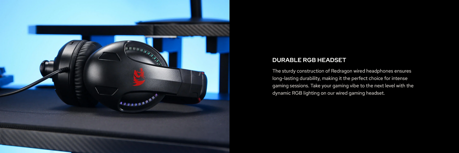 The sturdy construction of Redragon wired headphones ensures long-lasting durability, making it the perfect choice for intense gaming sessions. Take your gaming vibe to the next level with the dynamic RGB lighting on our wired gaming headset.