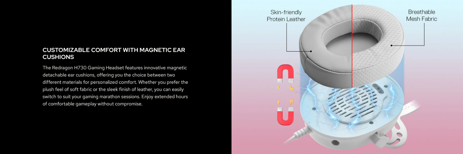 Play longer, play better. The Thoridal H730 features innovative magnetic detachable ear cushions, giving you the choice between two materials for personalized comfort — soft breathable mesh fabric or skin-friendly protein leather. Easily switch between them to suit your gaming marathon sessions and enjoy extended hours of comfortable gameplay without compromise.