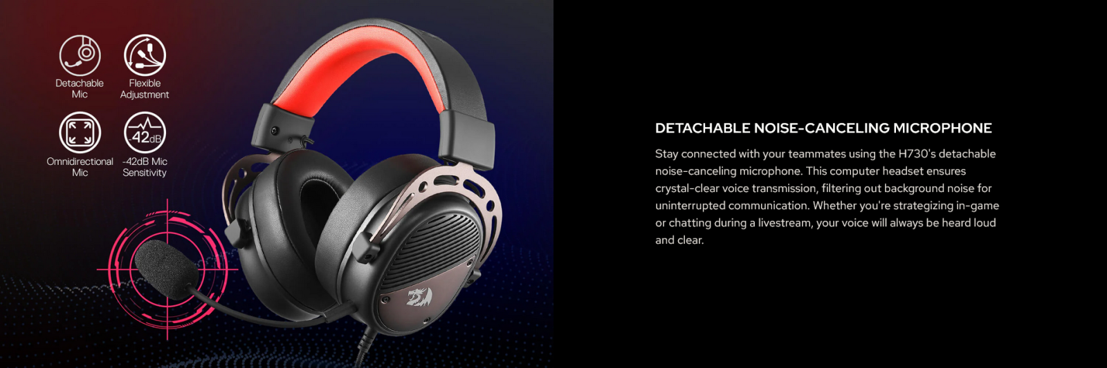 Stay connected with your teammates at all times. The H730's detachable omnidirectional noise-cancelling microphone ensures crystal-clear voice transmission, filtering out background noise for uninterrupted communication. Whether you're strategizing in-game or chatting during a livestream, your voice will always be heard loud and clear — with -42dB sensitivity and flexible adjustment for perfect positioning.