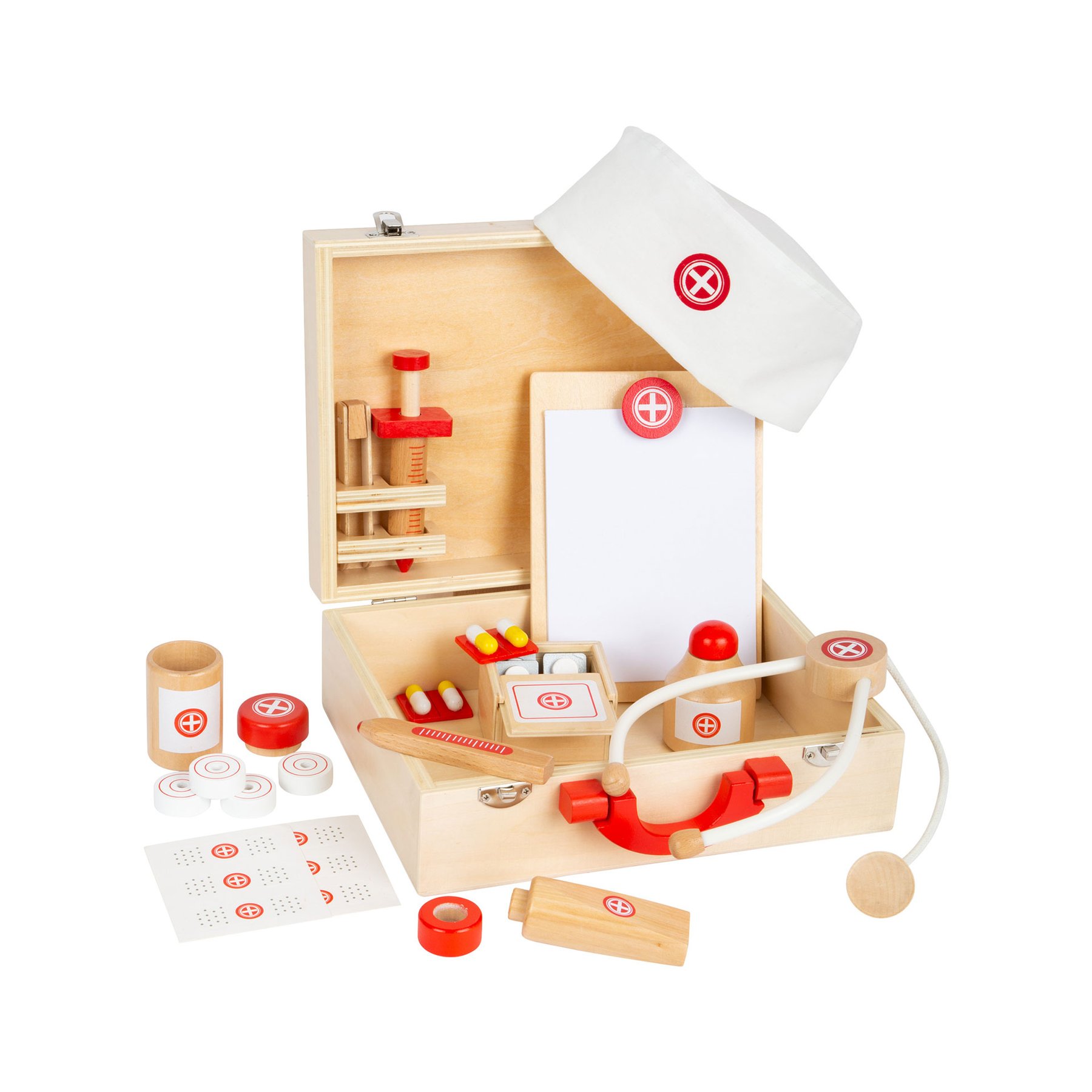 Докторът идва! Младите доктори ще бъдат добре оборудвани, когато отидат при своите пациенти, с този докторски дървен комплект. Калъфът и всички медицински инструменти правят страхотно впечатление с класическите си цветове и качествена изработка. В допълнение към бутилка с тинктура, стетоскоп и спринцовка, комплектът включва също лепенки, таблетки, пинсети, клипборд с бележник и термометър. Този комплект има всичко необходимо за осигуряване на първа помощ на кукли или животни играчки! Превключването в ролята на лекар и лечението на пациентите вдъхновява креативността и укрепва самочувствието на децата. Ролята на доктор и грижата за пациентите насърчава креативността, като същевременно укрепва детското самочувствие. Всички аксесоари се побират в дървения куфар.